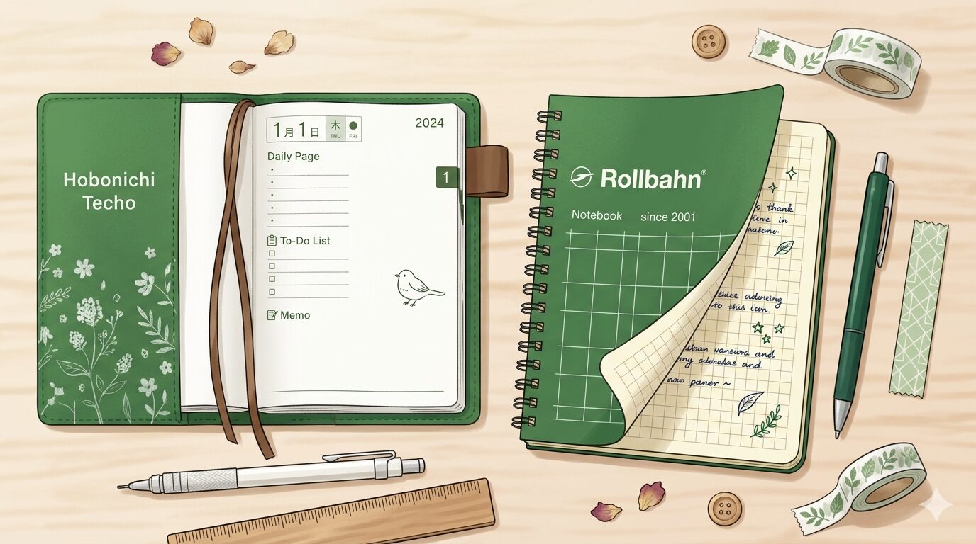 - ほぼ日手帳は「1日1ページのライフログ」、ロルバーンは「月間スケジュール+自由メモ」という異なるコンセプトの手帳