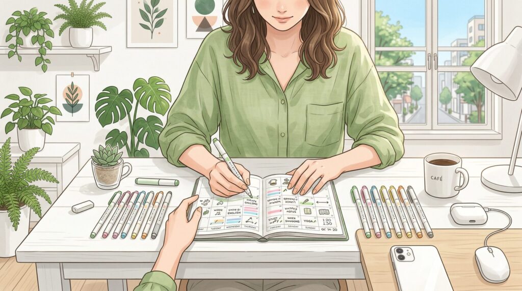 色分けは多くしすぎると続きません。仕事=青・プライベート=緑・勉強=オレンジなど2〜3色に絞るのが長続きのコツ。マイルドライナーとの組み合わせがSNSでも人気です。